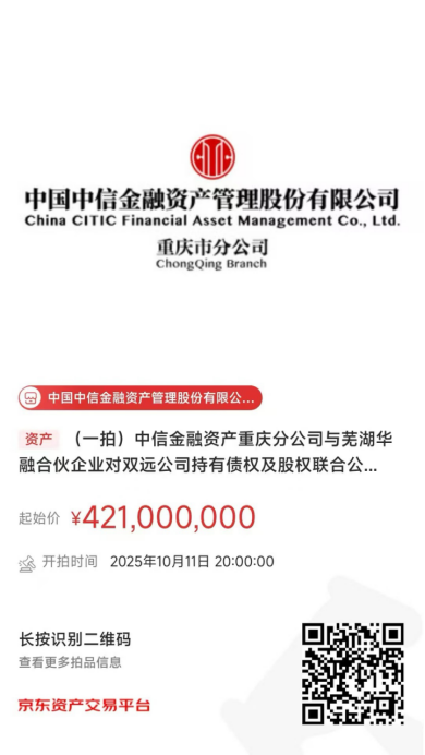 中國中信金融資產(chǎn)管理股份有限公司重慶市分公司(簡稱:中信金融資產(chǎn)重慶分公司)與蕪湖華融資本創(chuàng)榮投資中心(有限合伙)(簡稱:蕪湖華融合伙企業(yè))對重慶雙遠實業(yè)(集團)有限公司(簡稱:雙遠公司)持有債權及股權,將于2025年10月11日20時至2025年10月12日20時在京東拍賣網(wǎng)通過公開競價方式進行處置,拍賣鏈接如下圖所示,現(xiàn)予以公告。