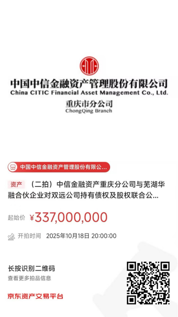 中國(guó)中信金融資產(chǎn)管理股份有限公司重慶市分公司(簡(jiǎn)稱:中信金融資產(chǎn)重慶分公司)與蕪湖華融資本創(chuàng)榮投資中心(有限合伙)(簡(jiǎn)稱:蕪湖華融合伙企業(yè))對(duì)重慶雙遠(yuǎn)實(shí)業(yè)(集團(tuán))有限公司(簡(jiǎn)稱:雙遠(yuǎn)公司)持有債權(quán)及股權(quán),將于2025年10月18日20時(shí)至2025年10月19日20時(shí)在京東拍賣網(wǎng)通過(guò)公開(kāi)競(jìng)價(jià)方式進(jìn)行處置,拍賣鏈接如下圖所示,現(xiàn)予以公告。